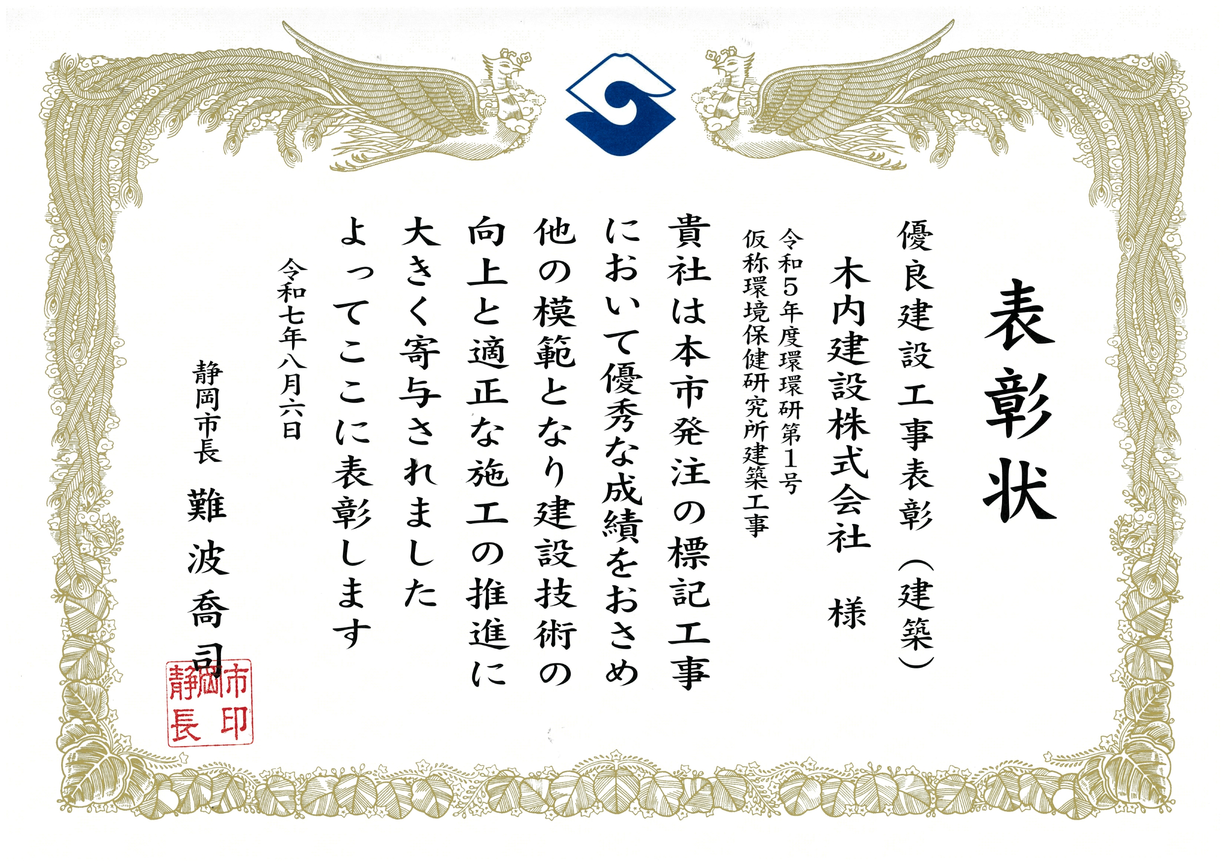 静岡市優良建設工事等表彰 受賞報告