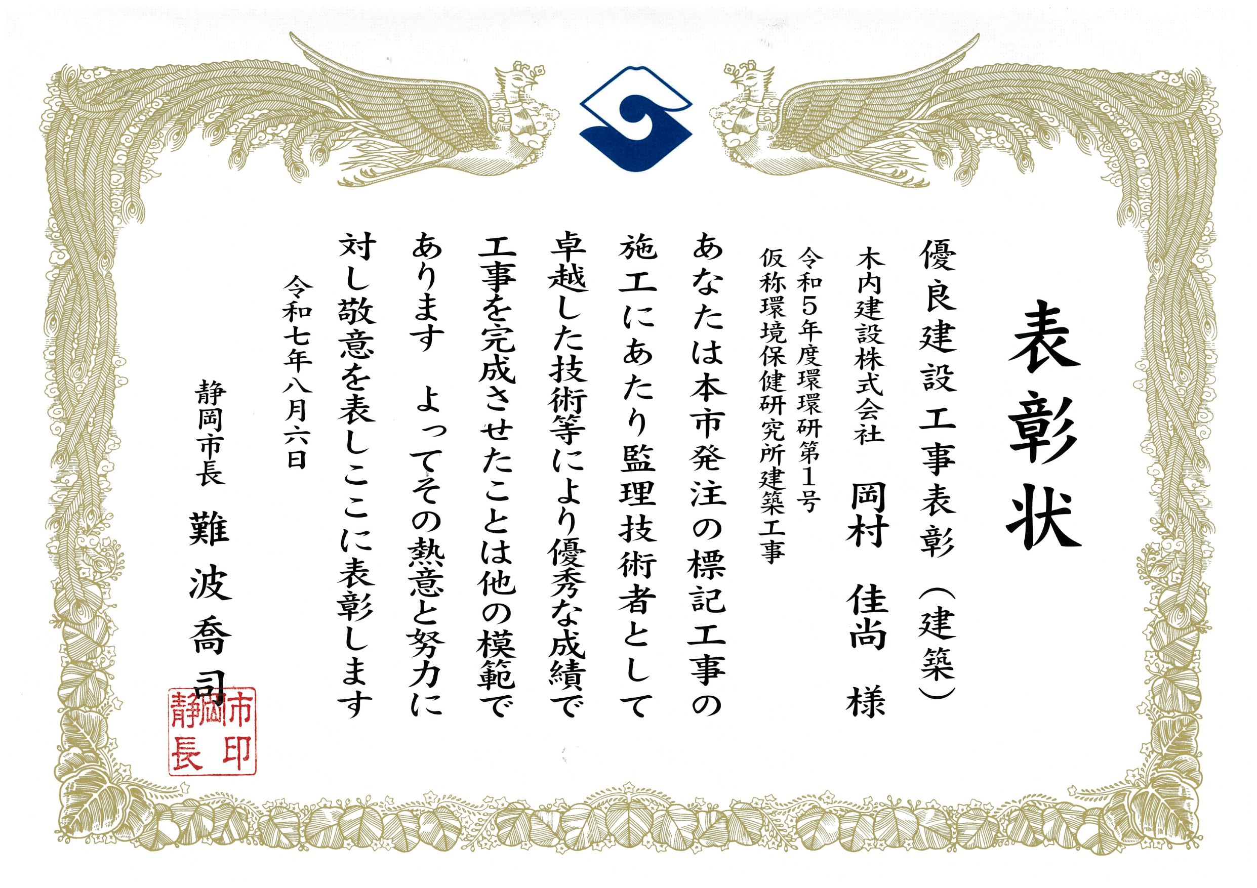 静岡市優良建設工事 (技術者) 木内建設(株) 岡村 佳尚