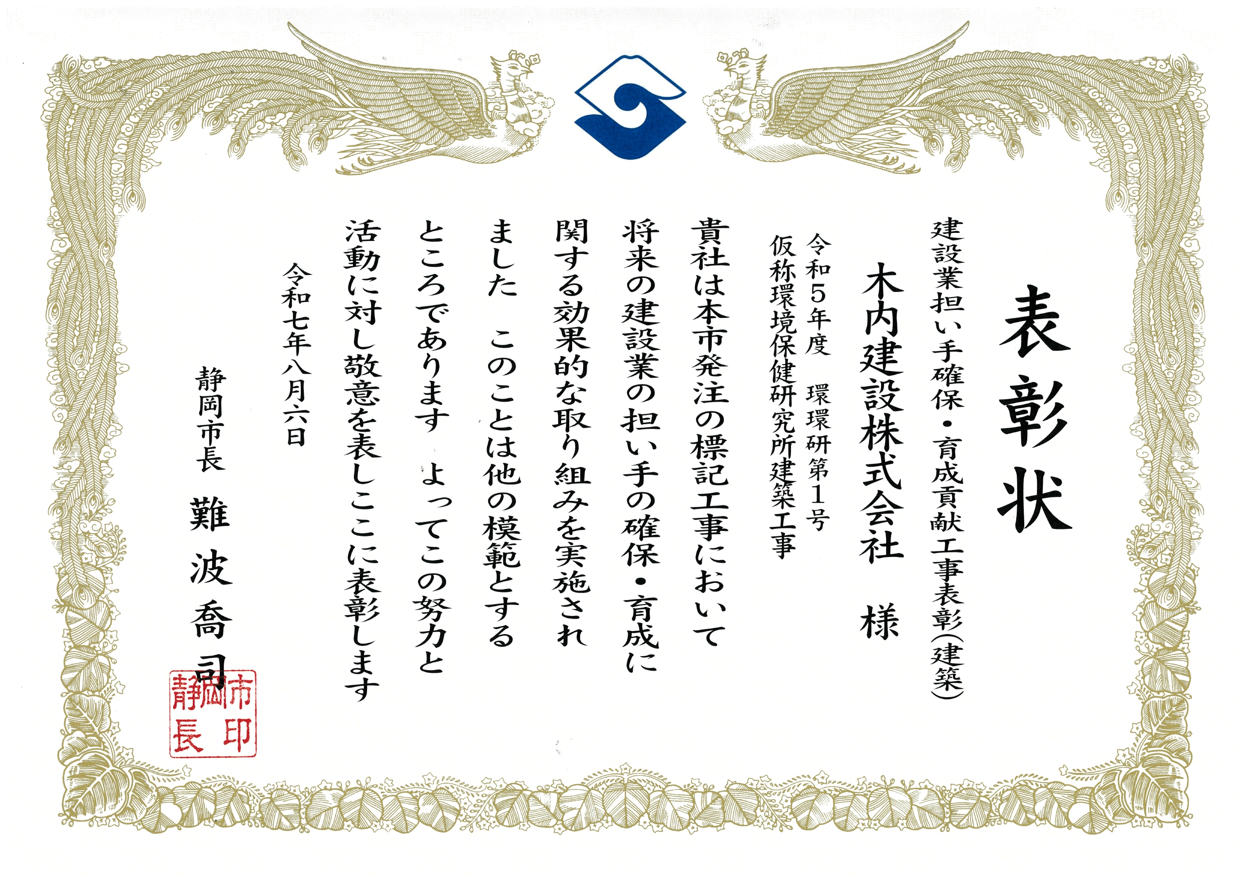 静岡市建設業担い手確保・育成貢献工事 (建築) 木内建設(株)