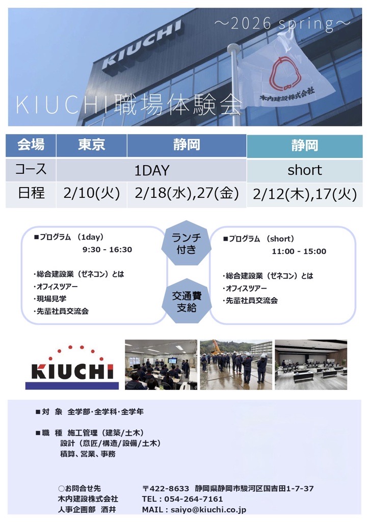 木内建設㈱ 職場体験会 担当窓口 054-261-7161